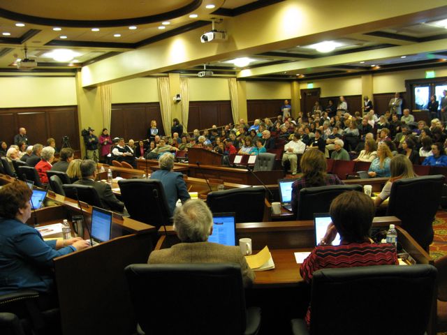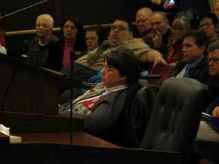 So far, 43 people have testified in two hours to JFAC on Health & Welfare funding this morning, including disabled people who receive services, their advocates, parents and other family members, and numerous providers, ranging from dentists to those who provide psycho-social rehabilitation services to people with mental illness. Here, members of JFAC, who have been joined by several members of both the House and Senate Health & Welfare committees, listen as Shiloh Blackburn of Rexburg testifies; in her wheelchair, she’s partially hidden behind the podium. Blackburn urged lawmakers to consider raising revenue rather than cutting services for Idahoans with disabilities. A recurring theme among those testifying is that those cuts will actually cost the state more, by forcing more people into costly institutionalization.