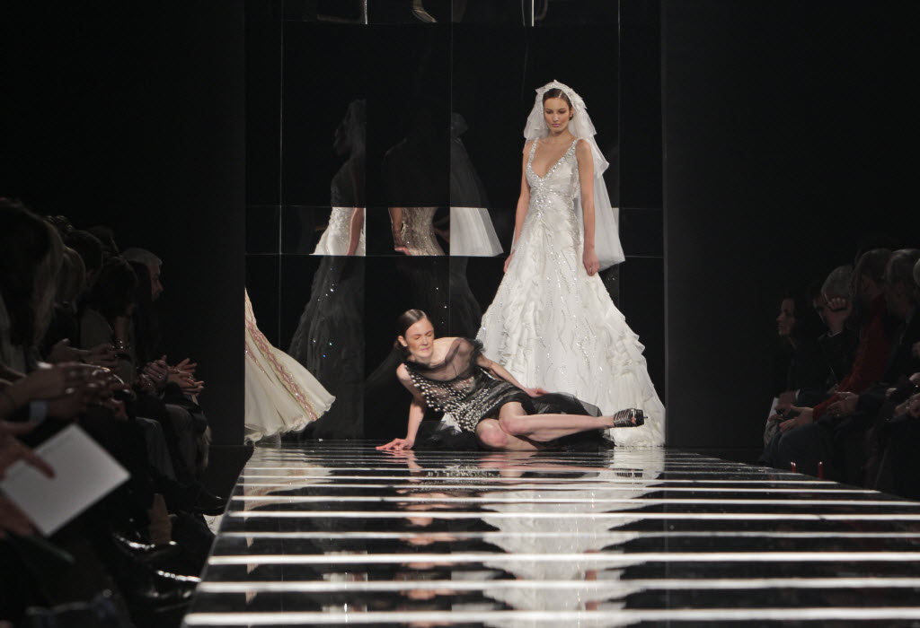 A model falls on the catwalk during Tony Ward’s Spring-Summer 2011 collection during the AltaRoma fashion week, in Rome, Monday. (AP Photo/Andrew Medichini)