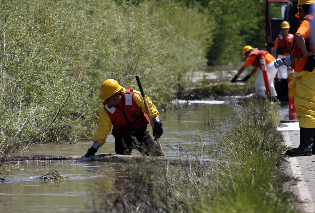 Cleanup crews work to clear oil from along side the Yellowstone River in Laurel, Mont., Tuesday. The Yellowstone River swelled above flood levels Tuesday, raising fears that the surge will push thousands of gallons of oil spilled from a broken pipeline into undamaged areas and prolong cleanup efforts as crude seeps downstream and into back channels. Story here. And: KEA Blog reaction . (AP Photo/Jim Urquhart)