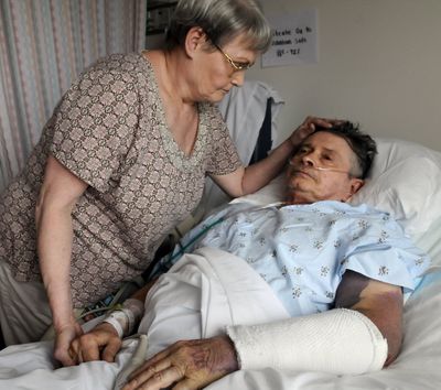 Helen Widener, 69, comforts her husband, Dennis, 67, June 29, as he recovers in Providence Sacred Heart Medical Center. Dennis was injured ina hit-and-run accident while he was riding his bike near the corner of Division Street and Garland Avenue. Story below. (SR photo: Dan Pelle)