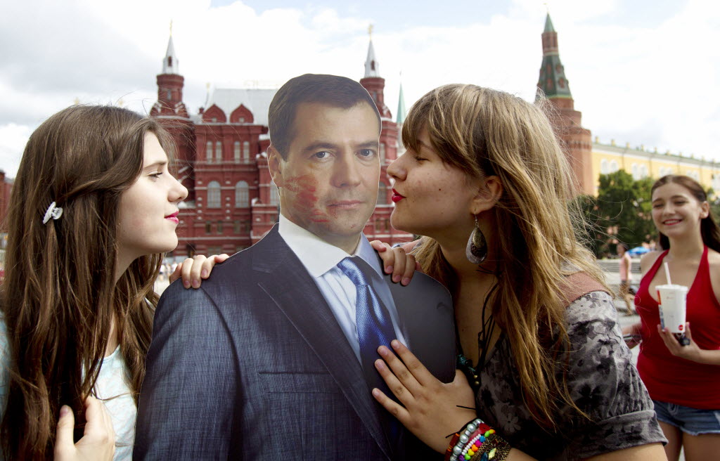 Two Russian women kiss a lipstick-smeared cardboard cutout of Russian President Dmitry Medvedev outside the Kremlin in Red Square, Moscow, earlier today to mark International Kissing Day. The cutout was later removed by police. (AP Photo/Ivan Sekretarev)