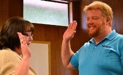 (Coeur d’Alene School Board clerk Lynne Towne swears in Trustee Tom Hamilton July 1)