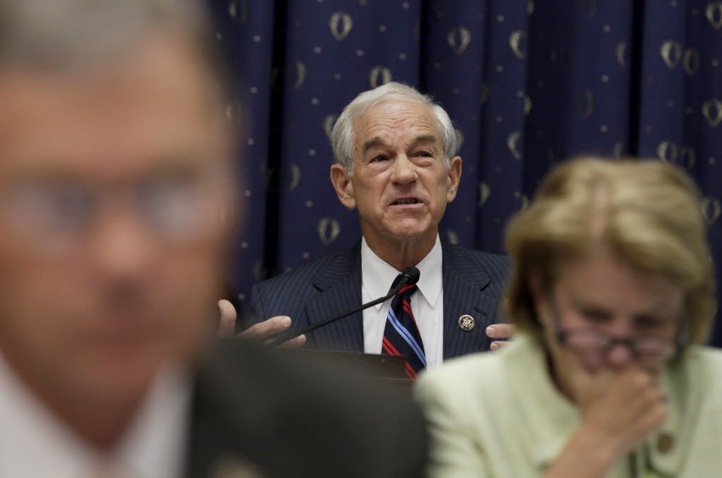 House Financial Services Committee member, and Republican presidential candidate, Rep. Ron Paul, R-Texas, speaks on Capitol Hill in Washington, Wednesday, during the committee’s hearing where Federal Reserve Chairman Ben Bernanke delivered the Semiannual Monetary Policy Report . Paul has announced that he won’t seek re-election to focus his attention on his GOP presidential bid. (AP Photo/Carolyn Kaster)