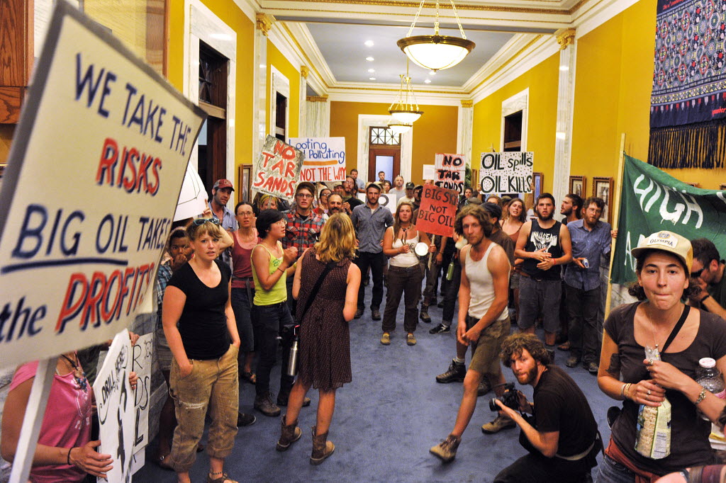 Anti oil protesters beat on drums, sing, dance and chant in the governor’s office in Helena, Mont. Tuesday. Montana Gov. Brian Schweitzer met with the pipeline protesters who occupied his office and demanded he renounce his support for a new pipeline project. (AP Photo/The Independent Record, Dylan Brown)