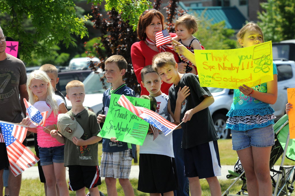 Children and families, some who never knew the soldier, watch as the procession carrying the body of Spc. Nicholas Newby down Ramsey Rd. passes the area of Lake City High School this afternoon on its from the Coeur d’Alene airport to Yates Funeral Home. Newby died in an expolosion in Iraq and his remains were returned for burial. (SR photo: Jesse Tinsley)