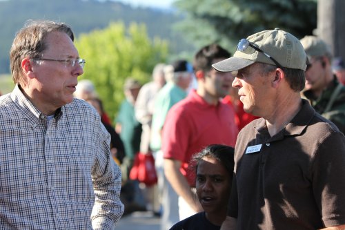 Wayne LaPierre, executive vice president of the National Rifle Association and a 2nd amendment advocate, speaks to state Sen. Steve Vick, R-Dalton Gardens, and Vick’s daughter, Tia. LaPierre was one of the guest speakers at the Tea Party Patriots gathering at the Stateline Speedway Friday night. I’ll have more photos and information about this event Monday.