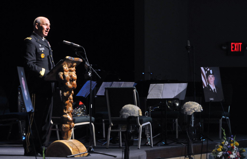 Idaho National Guard Brigadier General Alan Gayhart speaks about the sacrifice of Sgt. Nathan R. Beyers and Spc. Nicholas W. Newby Saturday at Lake City Community Church in Coeur d’Alene, where a joint memorial service was held for the two young men who were killed in Iraq July 7. (SR photo: Jesse Tinsley) Also: KHQ video of funeral for Nathan Beyers here.