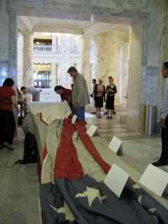 Here, Idaho Gov. Butch Otter takes a stitch; others who showed up on the second floor of the Capitol rotunda, from young students to wounded warriors, got a chance to do likewise. Idaho’s patch for the flag was constructed of fabric from a flag that flew over the Idaho National Guard Joint Force Headquarters; each state’s patch is coming from American flags that were bound for retirement. The flag was first stitched back together by tornado survivors in Greensburg, Kansas seven years after the 9/11 attacks. There’s more info here .