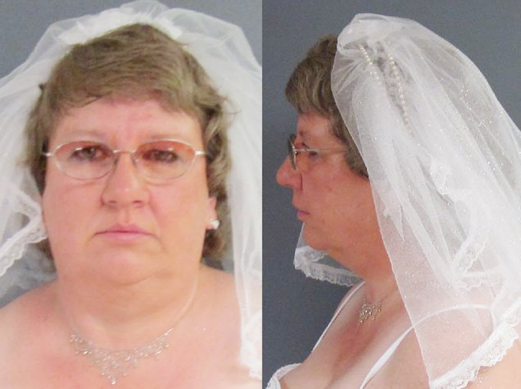 Authorities say Michigan bride Tammy Lee Hinton was arrested in her wedding dress on a felony warrant after exchanging vows at a Jackson, N.Y., area church. Police say she was arrested on a 3-year-old warrant for identity theft, booked and released after less than about 30 minutes. The Jackson Citizen Patriot reports Hinton was scheduled to appear Monday in Jackson County District Court, but she missed the court date. You write the cutline. (AP Photo/Jackson County Sheriff’s Office via Jackson Citizen Patriot)