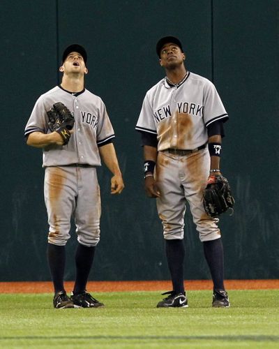 New York Yankees left fielder Brett Gardner, left, and center fielder Curtis Granderson look up after Granderson lost a fly ball in the roof of Tropicana Field, allowing the ball to drop for a single by Tampa Bay Rays’ Justin Ruggiano during the eighth inning of a baseball game Tuesday in St. Petersburg, Fla. You write the cutline. (AP Photo/Mike Carlson)