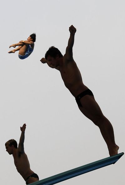 Divers are silhouetted as they warm up during the FINA Swimming World Championships in Shanghai, China, Wednesday. (AP Photo/Wong Maye-E)