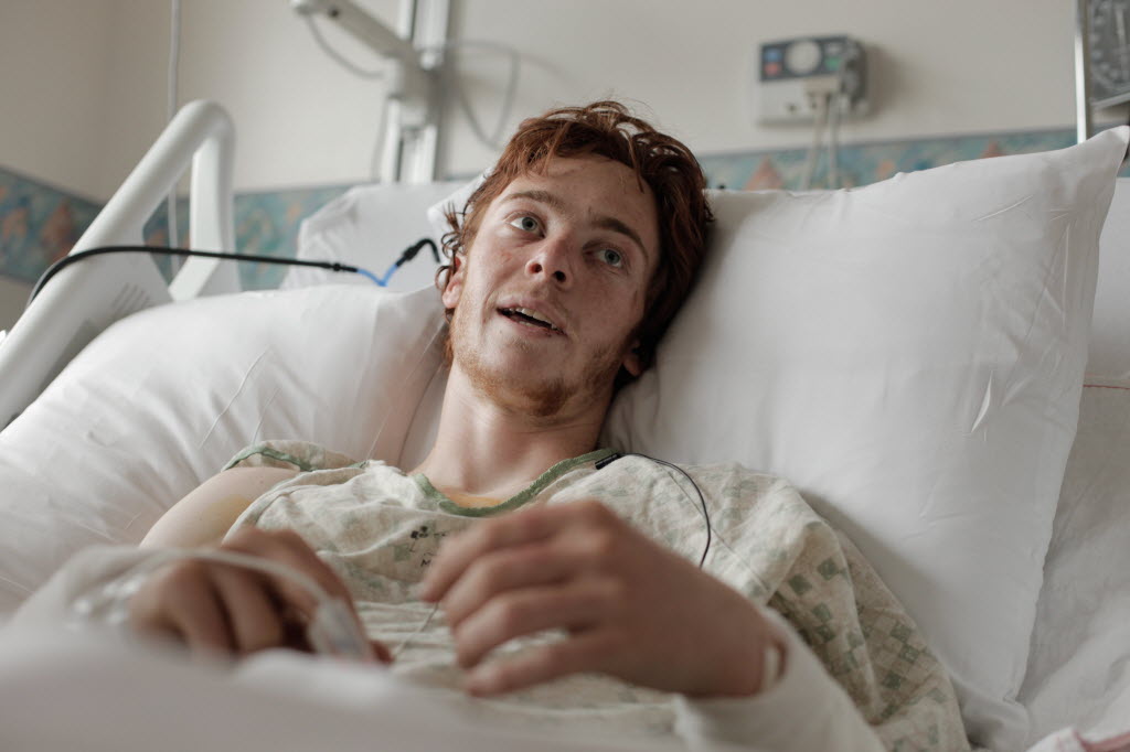 Samuel Gottsegen, 17, recounts his experiences as one of the victims of a bear attack that occurred Saturday evening near Talkeetna, Alaska, as he recovers in an Anchorage hospital on Monday. Gottsegen was taking part in an outdoor education course from the National Outdoor Leadership School. Story here. (AP Photo/Loren Holmes)