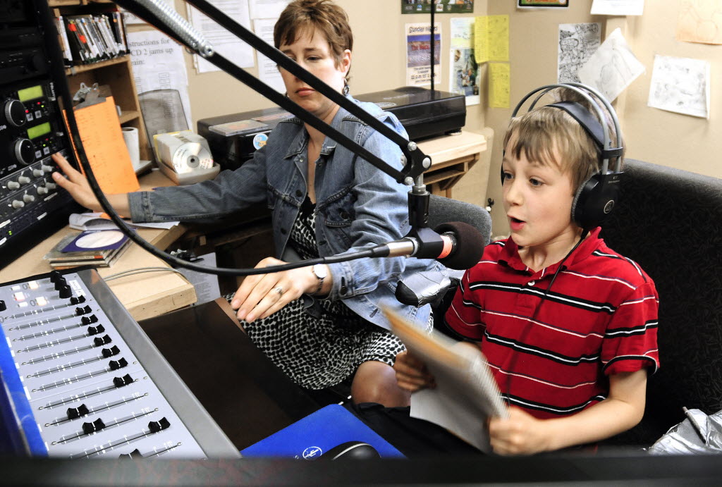 With a little help from his mom, Leanne, Oscar Hoffmann, 8, takes his place behind the mic during the Mr. Hoffman Show on 92.5 FM, in Moscow. Lewiston Tribune story here. (AP Photo/Lewiston Tribune, Kyle Mills)