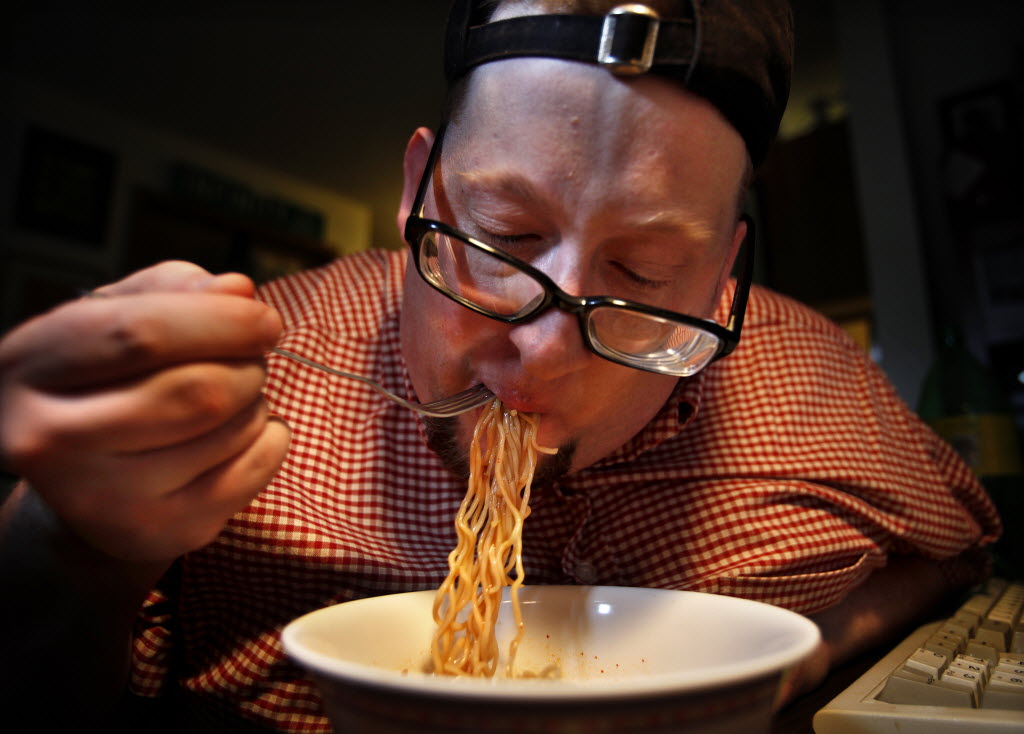 Sitting at his computer, Hans Lienesch aka “the Ramen Rater,” tests a dish of Ramen he purchased at Ranch 99 Market, just down the street from his home in Edmonds, Wash., Tuesday. Lienesch initially gave this ramen a score of 3.25 out of a possible 5. His reviews can be found on his web site, www.ramenrater.com. Story here . (AP Photo/The Herald, Dan Bates)