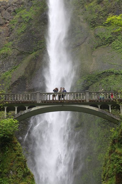 People gather to take photos from the lower falls bridge in front of Multnomah Falls along the Columbia River Gorge Tuesday, near Bridal Veil, Ore. States across the west are on the watch for potential flooding in the coming weeks once a record mountain snowpack starts melting and sending water gushing into rivers, streams and low-lying communities. (AP Photo/Rick Bowmer)