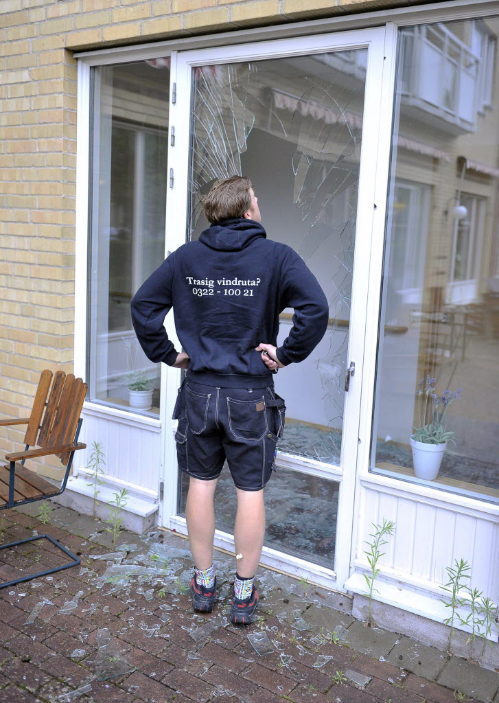 A glazier examines the damage after a moose burst into a geriatric care home in Alingsas east of Goteborg, Sweden earlier today. The moose jumped through a canteen window into the building in Alingsas in western Sweden Thursday. The residents were evacuated and the moose locked into a small room next to the entrance. Since the moose’s injuries were concluded to be minor it was released into freedom. You write the cutline. (AP Photo / Adam Ihse , SCANPIX)