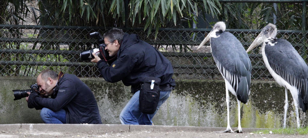 Marabous are seen watching photographers doing their work at an enclosure at the zoo in Duisburg, Germany earlier today. You write the cutline. (AP Photo/Frank Augstein)