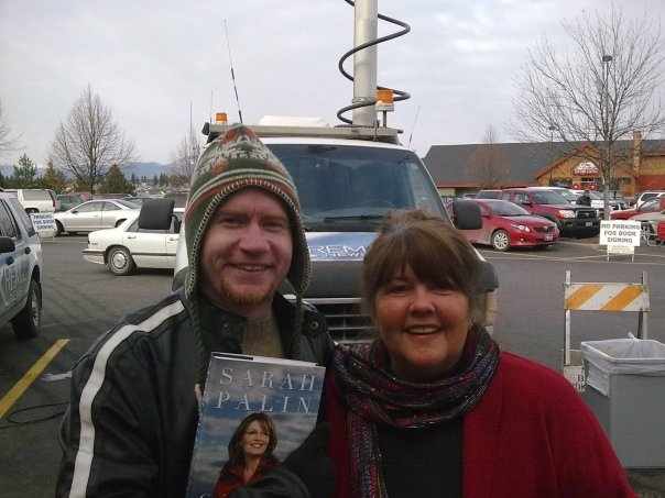 Matt poses with Kerri Thoreson after buying an autographed copy of Sarah Palin’s “Going Rogue” at Coeur d’Alene Fred Meyer in December 2009. Matt tells Huckleberries.