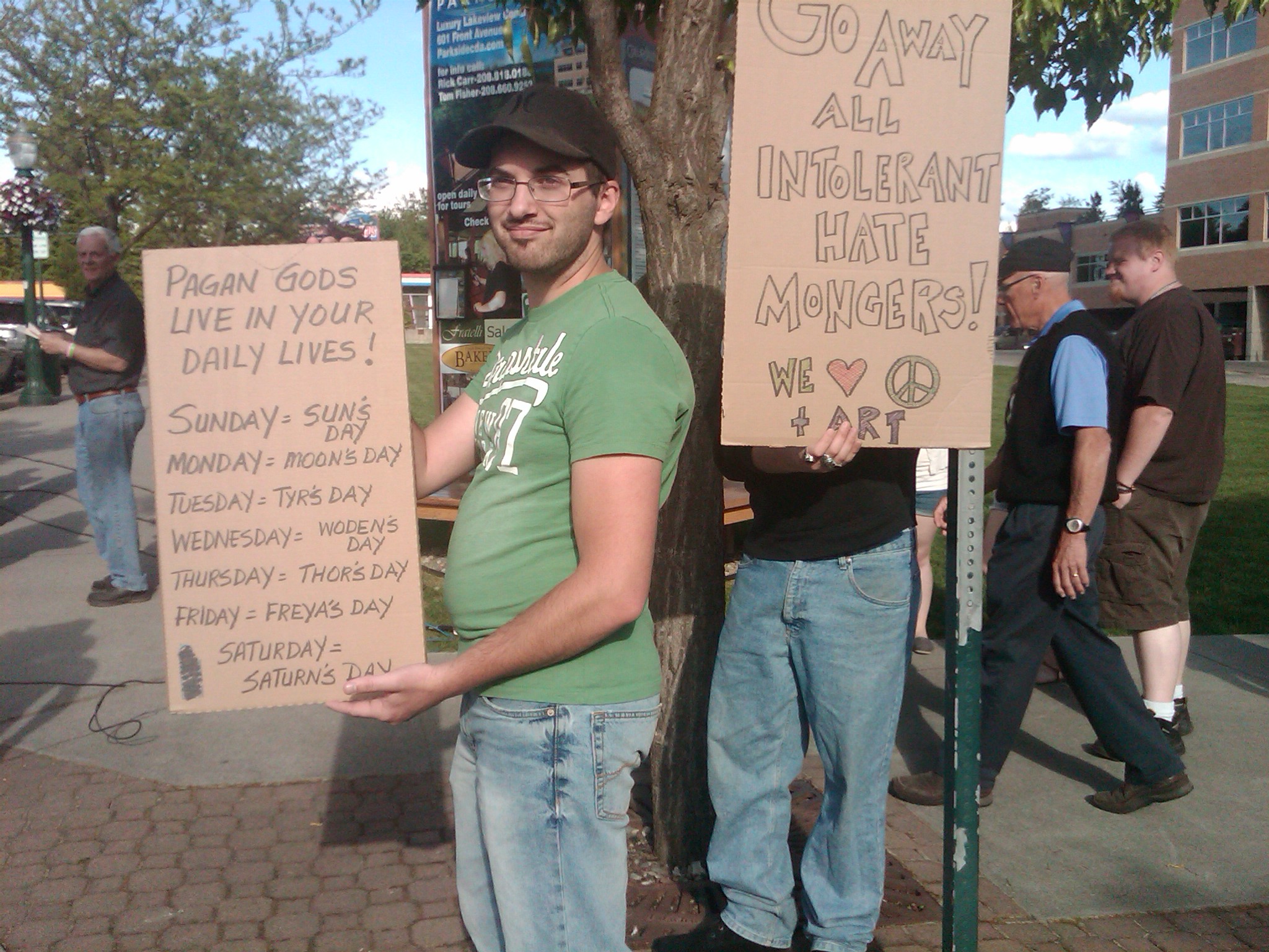 Counter-demonstrators held their own hand-made signs in support of the Hindu god Ganesha sculptor on the southeast corner of 6th & Sherman, in front of the Parkside building in downtown Coeur d’Alene. Recreation Director Steve Anthony (behind demonstrators on the left) handled the master of ceremonies duties at the dedication of the art-on-loan program that features 14 sculptors around downtown Coeur d’Alene. About 35 to 40 people attended the demonstration, some drawn to it by the controversy surrounding the Ganesha art display.