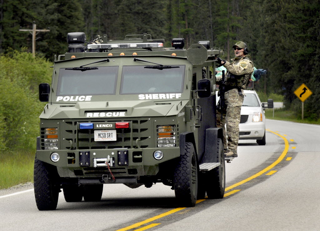 A Missoula County Sheriff’s Department SWAT team drives on U.S. Highway 12 near Lolo, Mont., last week after officers responded to a tip about about person living in a remote cabin in the area that they suspected might be fugitive former militia leader David Burgert. Several law enforcement officers from the Missoula County Sheriff’s Department and the FBI responded to the area but did not find Burgert. Increasingly, extremists are finding fertile ground for their views in northwest Montana. Story here. (AP Photo/Missoulian, Kurt Wilson)