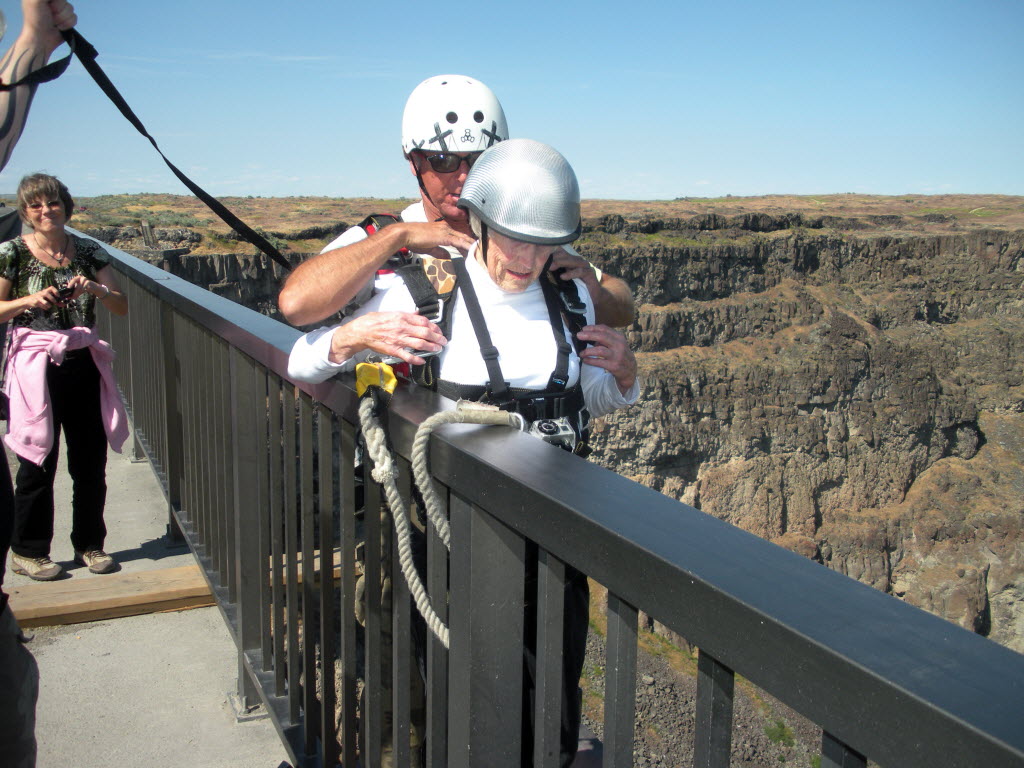 Lena Thomas gets ready to BASE jump Twin Falls recently. Thomas checked off another item on her to-do list last week when she and 58-year-old daughter Terri Scott, of Concord, Calif., BASE jumped off the Perrine Bridge. Both jumped tandem with an instructor, and an observer found Thomas remarkable. Story here . (AP Photo/Lena Thomas)