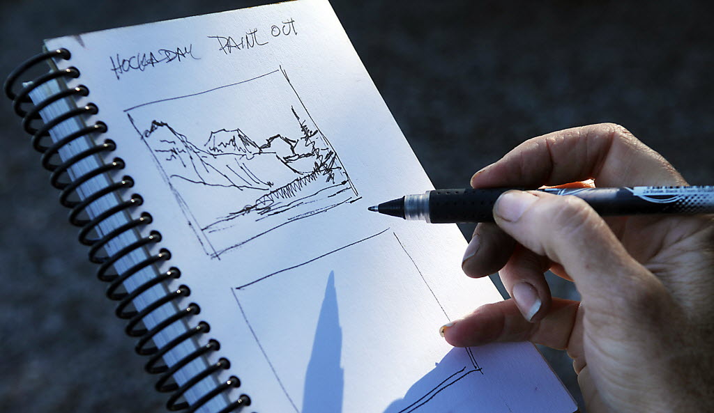 Wanda Mumm of Eureka, Mont., does a thumbnail sketch of the mountains over McDonald Lake on Wednesday morning Glacier National Park. Mumm was one of thirty artists taking part in the Hockaday Paint Out. The painting produced this week will be on sale to the public on Saturday evening at the Hockaday Museum of Art Centennial Pavilion Tent in Kalispell, Mont. (AP/Daily Inter Lake, Brenda Ahearn)