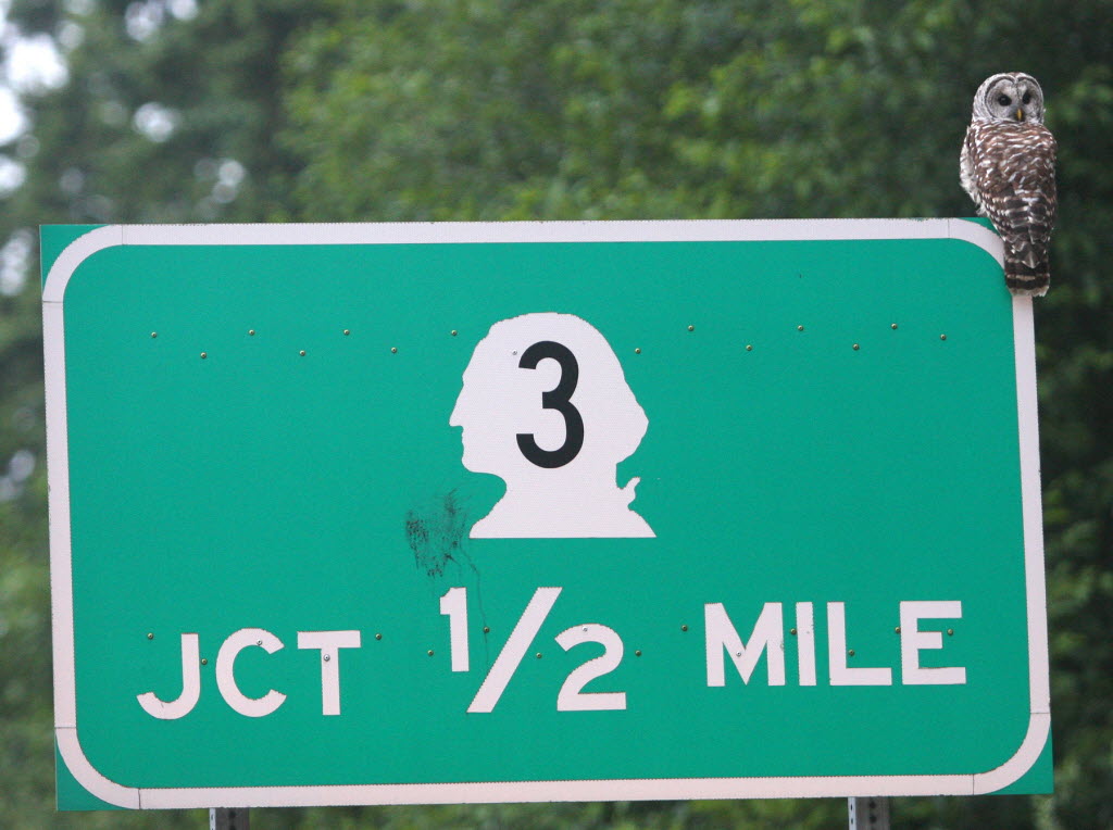 A barred owl perches on a highway sign in Poulsbo, Wash., just before sunrise. Barred owls usually hunt at night and return to their nests during the day. (AP Photo/Kitsap Sun photo: Larry Steagall)