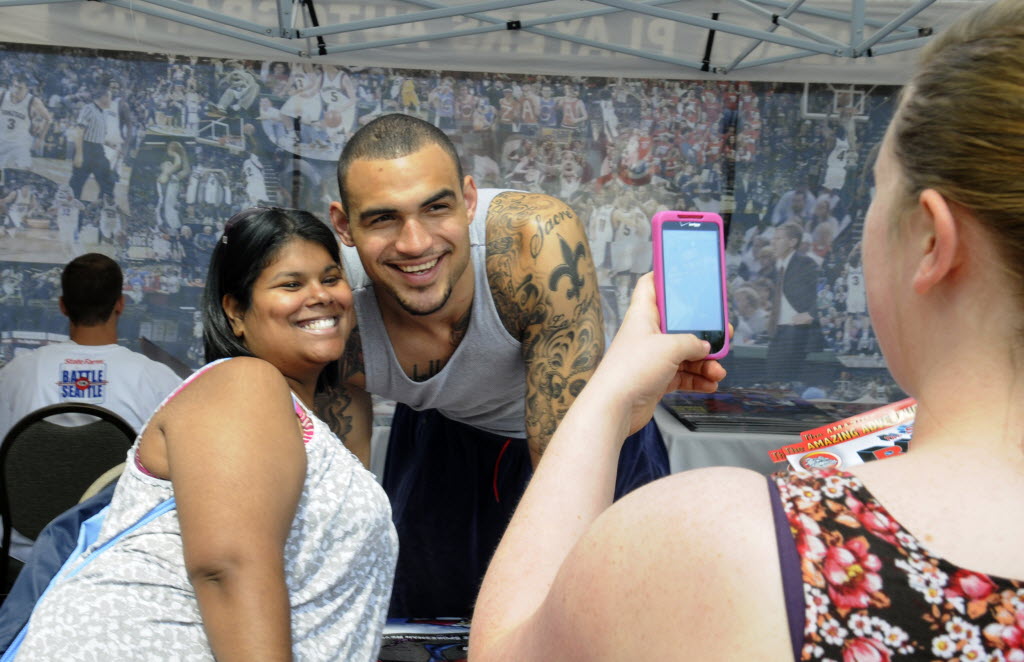 Gonzaga University star Robert Sacre’ poses with Kelli Allison of Spokane, during the State Farm Battle in Seattle Autograph session Saturday as her friend, Rebecca Estelle, snaps a picture. (SR photo: J. Bart Rayniak)