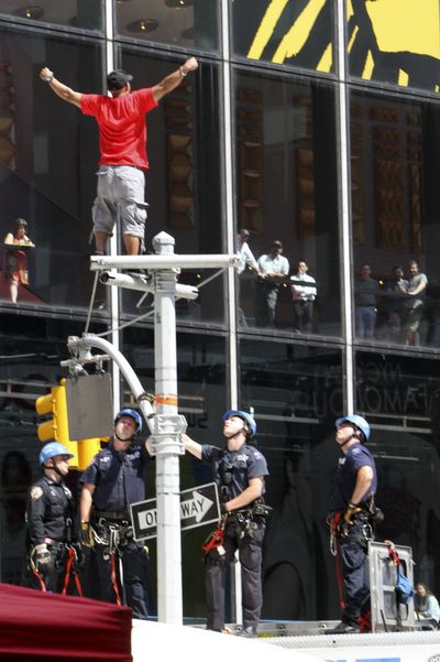 New York City police officers watch while an unidentified man who climbed a traffic light pole in New York’s Times Square earlier today. You write the cutline. (AP Photo/Mary Altaffer)
