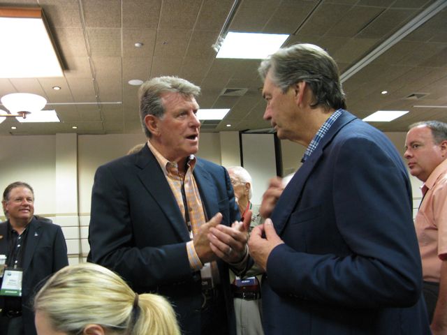 Idaho Gov. Butch Otter, left, buttonholes Canadian Ambassador Gary Doer on a water issue shortly before the start of the Western Governors Association conference in Coeur d'Alene on Wednesday. (Betsy Russell)