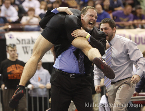 Coeur d’Alene wrestling coach Jeff Moffat celebrates with Caleb Davis after Davis beat Tim Hartwid of Caldwell High School in the 189 lb. weight class at the Idaho State High School Wrestling Tournament at the Idaho Center in Nampa on Saturday. (Idaho Statesman photo: Joe Jaszewski)