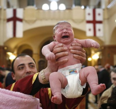 A baby cries during a baptizing ceremony in the Holy Trinity Cathedral in Tbilisi, Georgia, Thursday. About 400 babies were baptized during a special ceremony in the Holy Trinity Cathedral in the Georgian capital. (AP Photo/Shakh Aivazov)