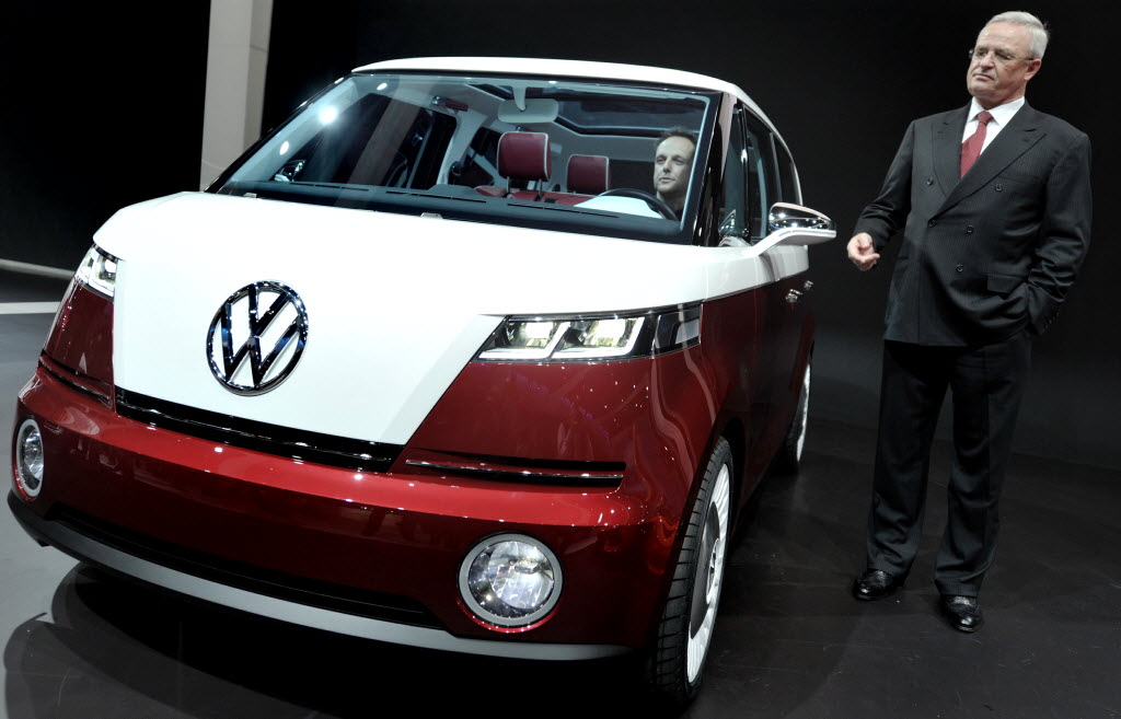 Volkswagen CEO Martin Winterkorn stands beside Volkswagen Bulli concept car during an event of the Volkswagen group on the eve of the 81st International Motor show in Geneva, Switzerland, Monday. (AP Photo/dapd, Sascha Schuermann)