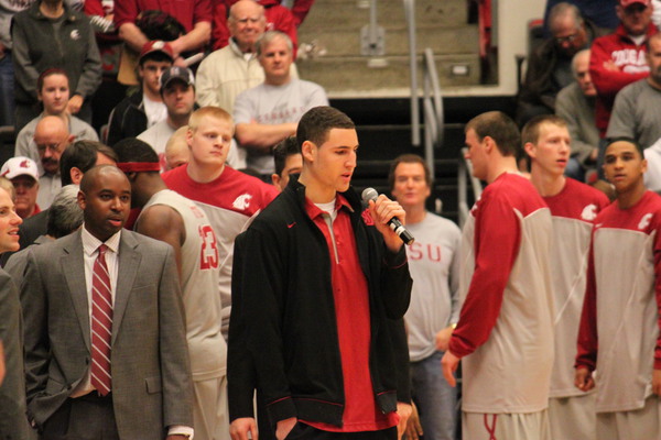 Klay Thompson, the Washington State basketball star who was arrested on a drug charge after the Cougs’ win over USC Thursday, apologizes to the crowd before today’s final Pac-10 game with UCLA in Pullman. Shorthanded, the game Cougars led UCLA by 13 at half and were tied at the end of regulation before falling in overtime. ESPN/AP game story & boxscore here. (Washington State athletics media relations via Twitter)