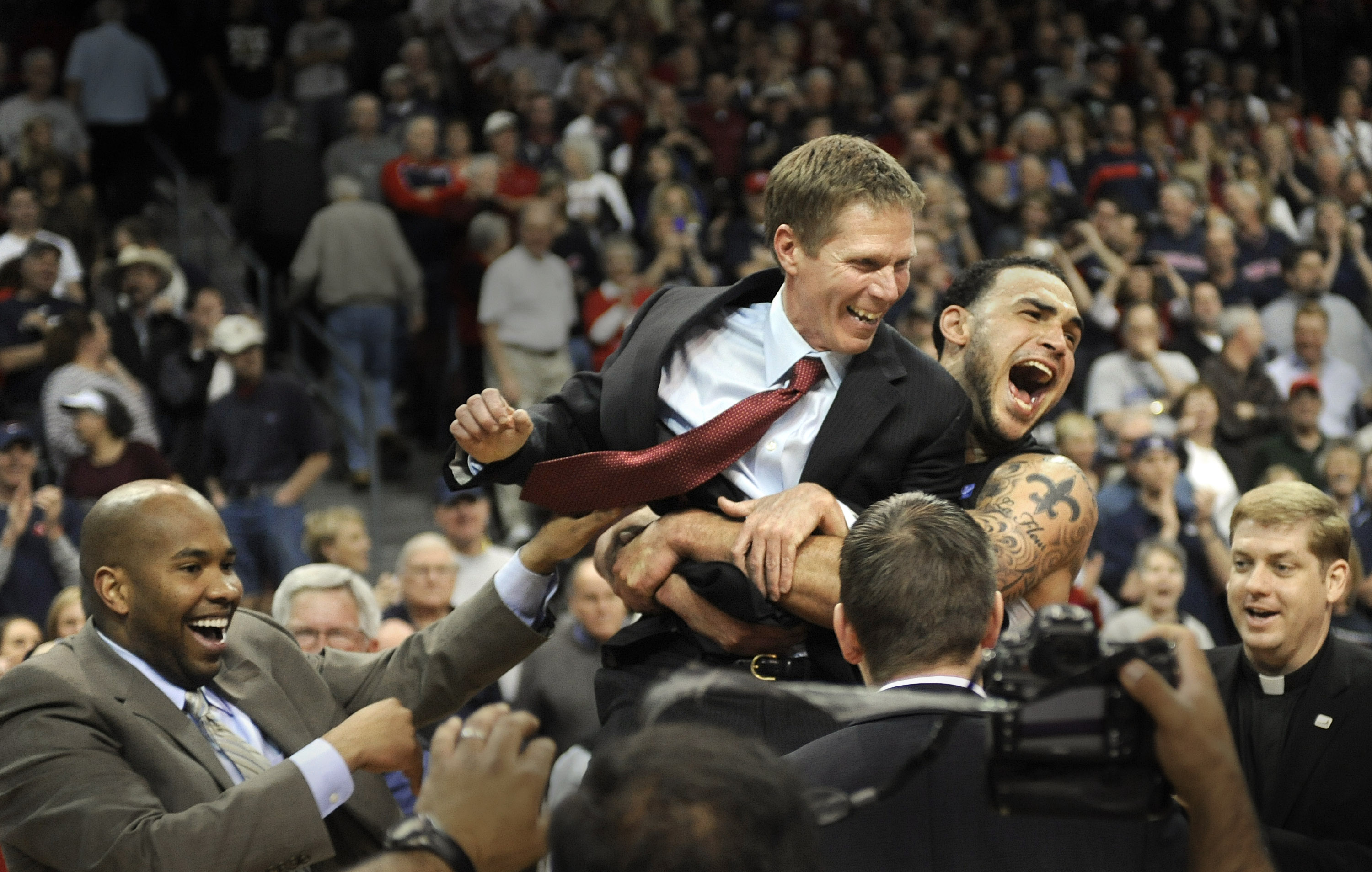 Gonzaga center Robert Sacre grabs Head Coach Mark Few and carries him to the rest of the team after the Zags beat Saint Marys for the WCC Tournament Championship Monday in Las Vegas. (SR photo: Christopher Anderson)