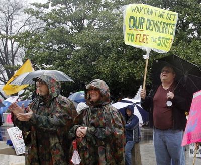 A fellow named Jim Egan, right, attends a tea party rally to support legislative efforts to do away with teachers’ collective bargainin rights on Saturday, in this Associated Press photo.