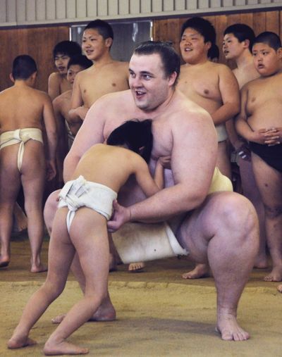 Sumo wrestler ozeki Baruto gives a sumo lesson to a child in Osaka, central Japan, Saturday. You write the cutline. (AP Photo/Kyodo News)