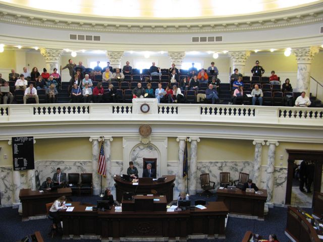 Here’s a view of the House Gallery, which is less than half full, though more people are arriving, as the House debates SB 1108 and SB 1110 this morning, the teacher contracts bill and the teacher merit-pay bill. Meanwhile, House Majority Caucus Chairman Ken Roberts, R-Donnelly, took over the bill-reading and got as far as page 13 of the 25-page bill; Rep. Cliff Bayer, R-Boise, then took over reading. People also can watch the debate online here .