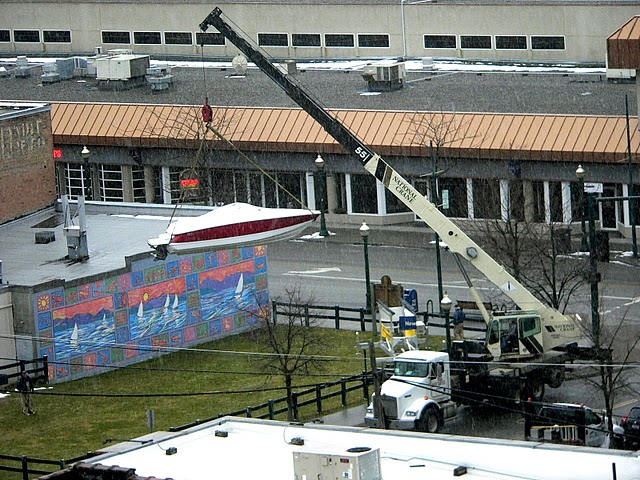 A large crane hoists a Hagadone Marine boat onto a display support at the site of the old Wilma Theater, 2nd & Sherman, in downtown Coeur d’Alene. Don Sausser, Huckleberries Eye On Downtown Coeur d’Alene, snapped this photo at 7:50 this morning through snowflakes and a double pane.