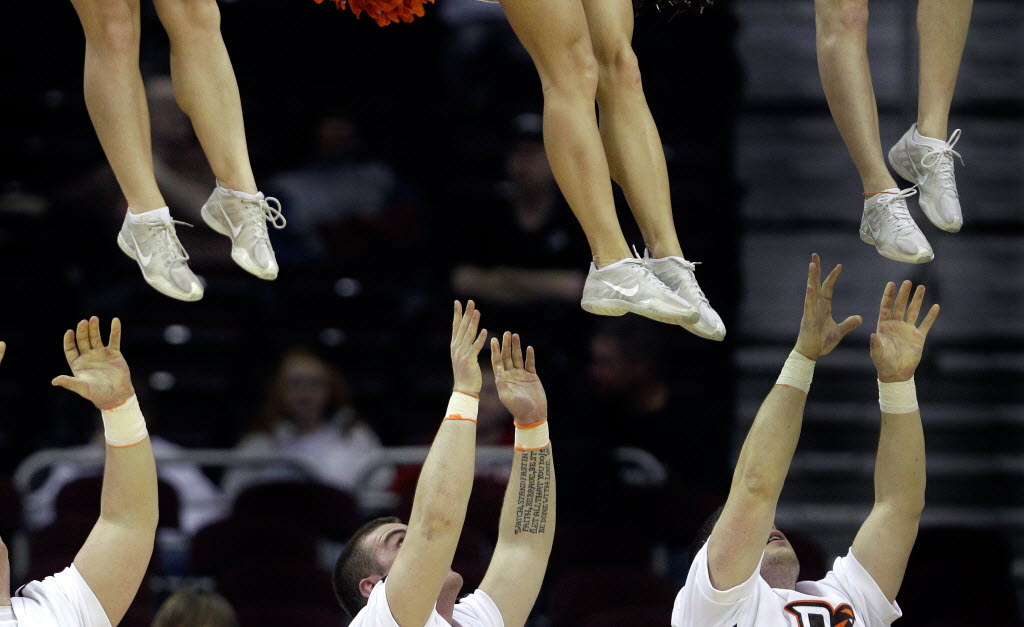 Male cheerleaders from Bowling Green toss their female counterparts into the air as their team took on Western Michigan in an NCAA college basketball game in the quarterfinals of the Mid-American Conference Tournament earlier today. You write the cutline. (AP Photo/Amy Sancetta)