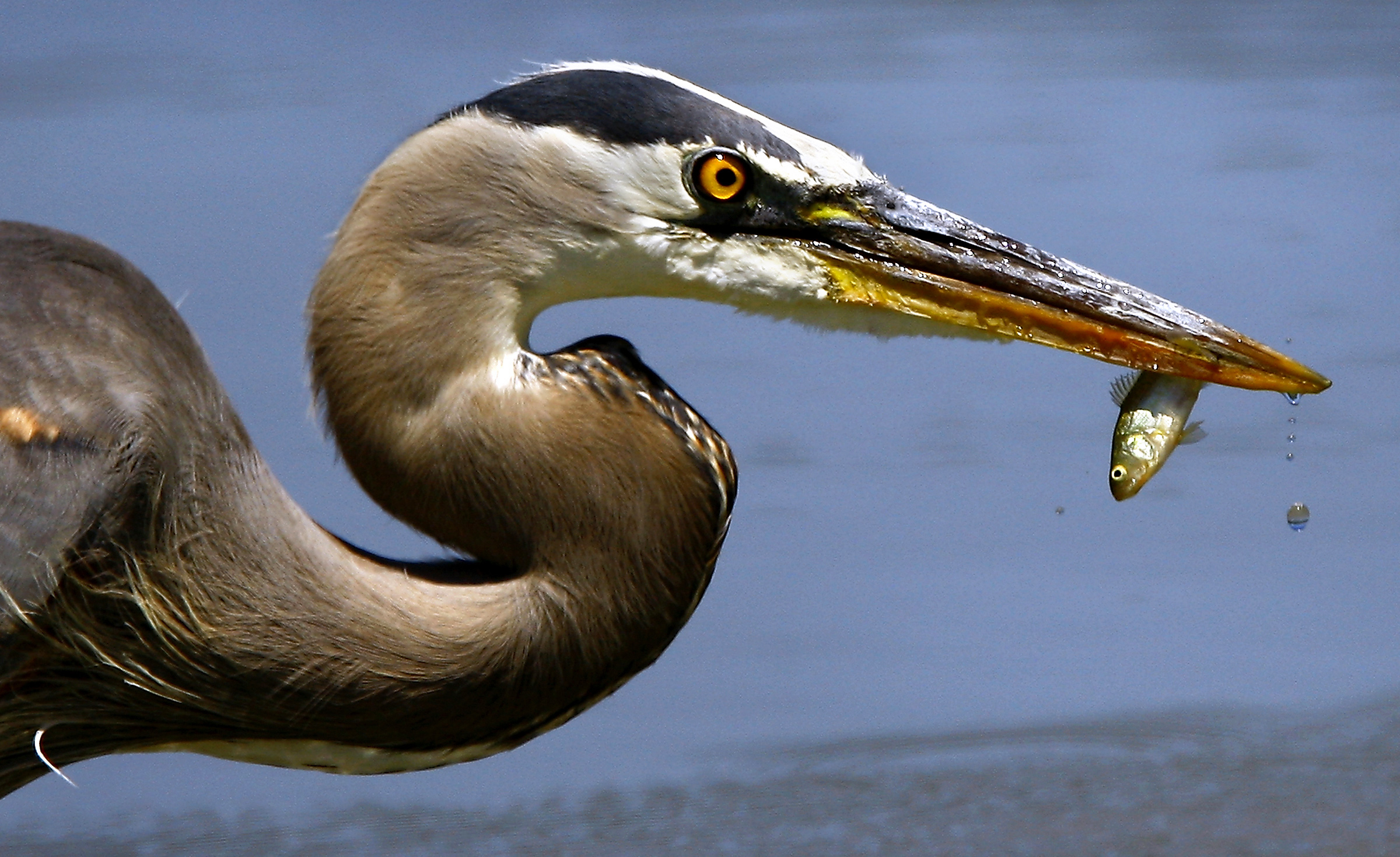 Great blue heron bows to goldfinch as state bird