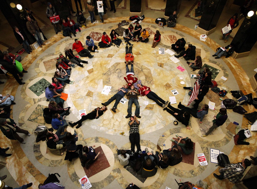 Students demonstrating at the Wisconsin State Capitol in Madison, Wis., form a peace sign on the floor of the rotunda Thursday. Demonstrations at the Wisconsin State Capitol continue as Assembly legislators voted to approve an amended version of Gov. Scott Walker’s controversial budget repair bill. (AP Photo/Wisconsin State Journal, John Hart)