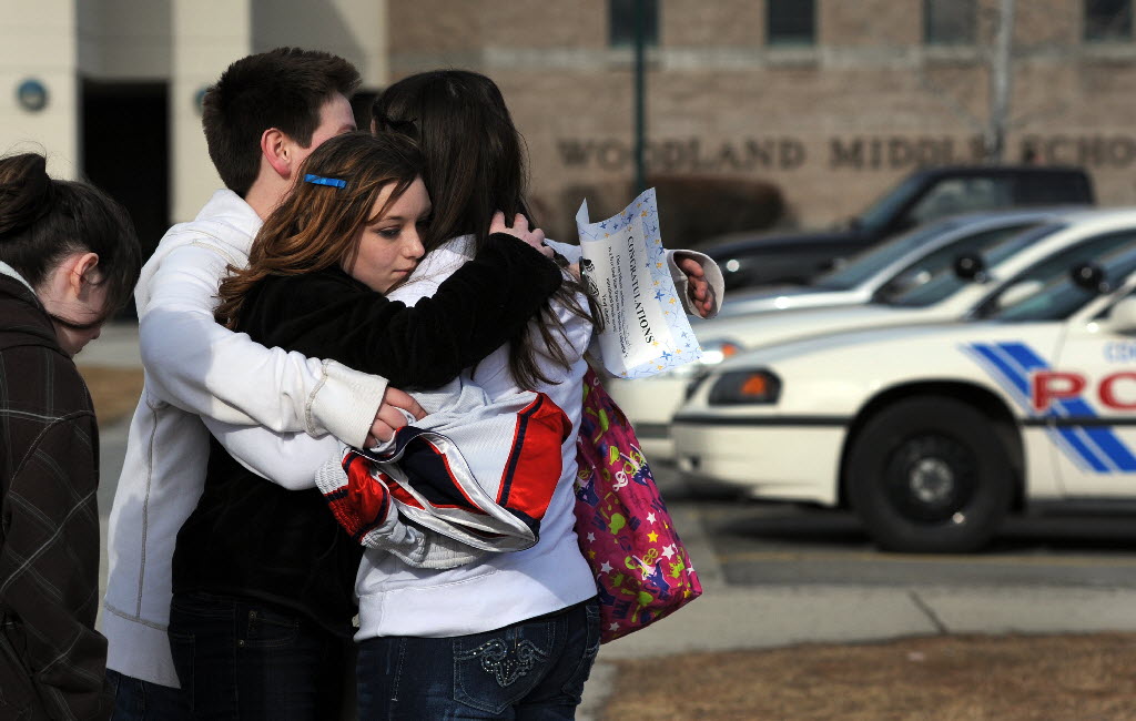 “It’s hard to believe that I know someone who would try and kill someone else,” said Woodland Middle School 7th grader Marissa DiQuarto, front facing, as she hugged fellow classmates after stabbing at the school in Coeur d’Alene on Friday, reported on Scanner Traffic in 2:27 p.m. item. An eighth-grader has been taken into custody. Jody Lawrence-Turner story here. (SR photo: Kathy Plonka)