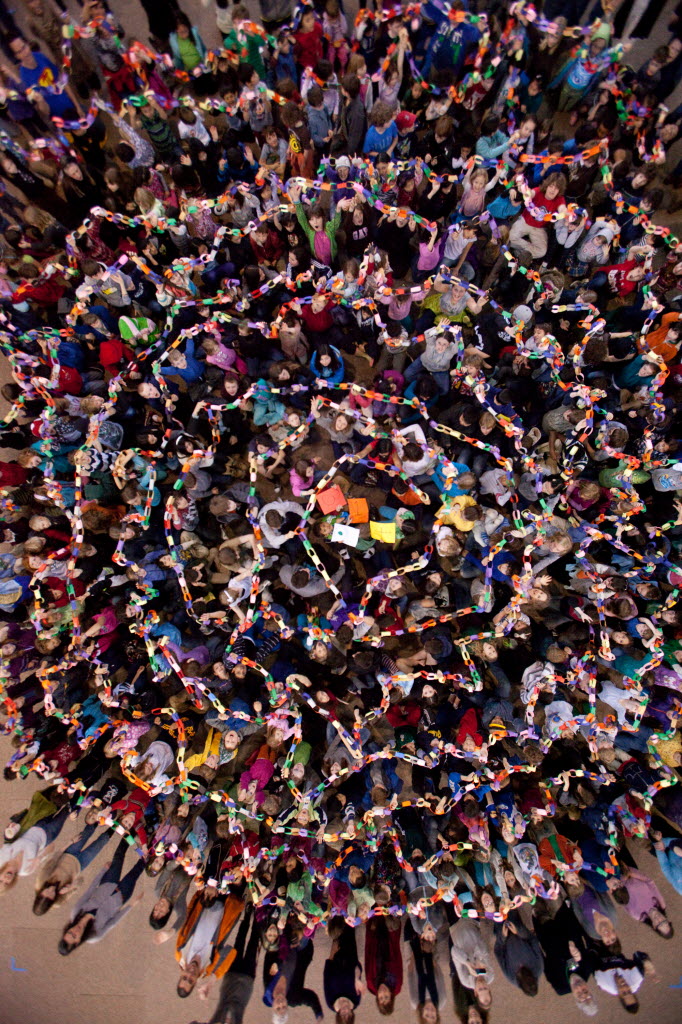 Students at The Evergreen School in Shoreline, Wash. hold up nearly 5,000 digits of the number Pi, each digit written on a link of a paper chain, during the 22nd annual Pi Day today. Pi is the number that expresses the ratio of a circle’s circumference to its diameter. Though it’s a number with no endpoint, its digits start with 3.14. (AP Photo/Seattlepi.com, Joshua Trujillo)