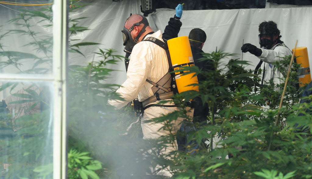 Federal agents and local authorities raid a medical marijuana operation today in Helena, Mont. Authorities from the Drug Enforcement Administration, the FBI, Lewis and Clark County sheriff’s office and Helena police watched over at least eight people in handcuffs outside Montana Cannabis west of Helena Monday afternoon. The greenhouse is the length of half a football field and packed with marijuana plants. Story here . (AP Photo/The Independent Record, Eliza Wiley)