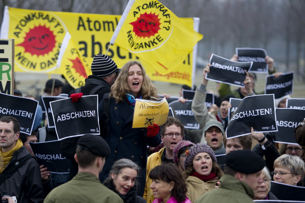 Demonstrators show signs reading ‘Switch off’ and flags reading: ‘Nuclear power, No Thanks’ as a protest against the nuclear power policy of chancellor Angela Merkel’s government near the German parliament in Berlin earlier today. Germany will take seven of its 17 nuclear reactors offline for three months while the country reconsiders plans to extend the life of its atomic power plants in the wake of events in Japan, Chancellor Angela Merkel said Tuesday. (AP Photo/dapd/ Axel Schmidt)