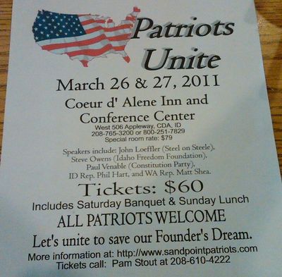 Interesting flyer e-mailed around this week by a Kootenai County Republican Central Committee official (and by Republican women in Sandpoint) — a Sandpoint Patriots meeting featuring speakers from Idaho Freedom Foundation, Constitution Party and Idaho Rep. Phil Hart …