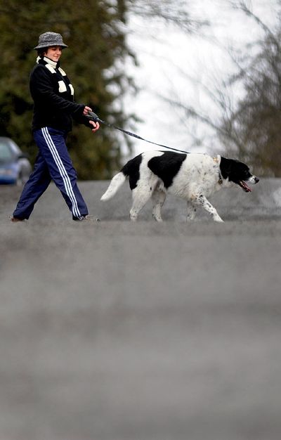 Taking to the street: Erika Ouzounian crosses Wallace Avenue along with Bob, her dog, in Coeur d’Alene on Tuesday. (SR photo: Kathy Plonka)