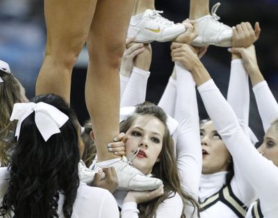 Vanderbilt cheerleaders perform a stunt in the second half of a Southwest regional second round NCAA tournament college basketball game against Richmond on Thursday in Denver. You write the cutline. (AP Photo/Ed Andrieski)