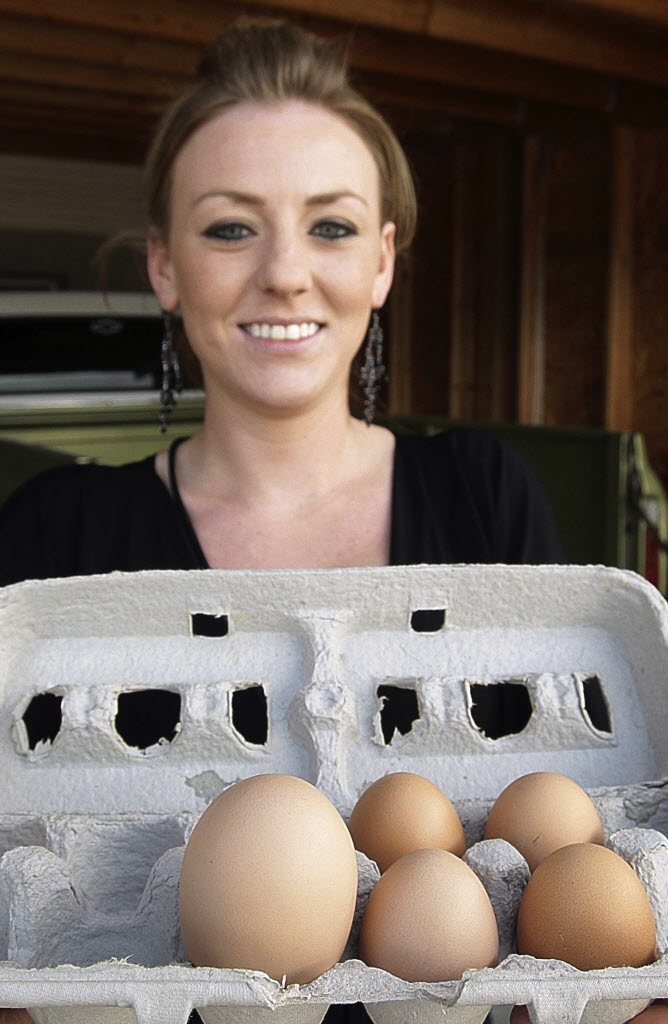 Becca Kays holds a giant egg from the chickens she and her brother raise on the 200 block of Johnson Lane in Lockwood, Mont., Thursday. A Montana hen really has something to cluck about. Unofficially, the egg is just over 3 inches tall and a little more than 2 inches wide. Kays’ grandmother was going to help with a more accurate measurement. Egg story video here . (AP Photo/The Billings Gazette, Bob Zellar)